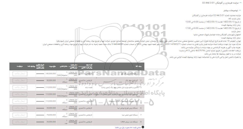 مزایده محدود شماره 02/44/2/01 شرکت فنرسازی زر گلپایگان