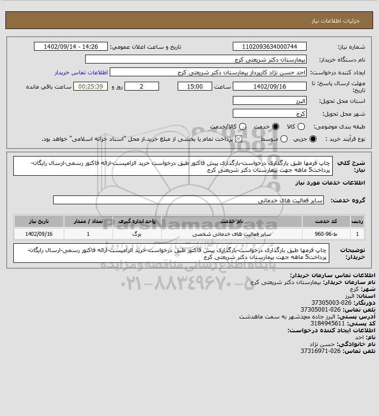 استعلام چاپ فرمها طبق بارگذاری درخواست-بارگذاری پیش فاکتور طبق درخواست خرید الزامیست-ارائه فاکتور رسمی-ارسال رایگان-پرداخت5 ماهه جهت بیمارستان دکتر شریعتی کرج, استعلام چاپ فرمها طبق بارگذاری درخواست-بارگذاری پیش فاکتور طبق درخواست خرید الزامیست-ارائه فاکتور رسمی-ارسال رایگان-پرداخت5 ماهه جهت بیمارستان دکتر شریعتی کرج