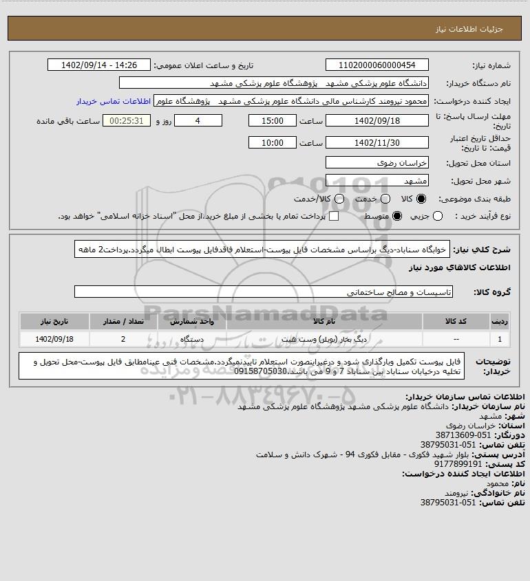 شرح کلی نیاز: خوابگاه سناباد-دیگ براساس مشخصات فایل پیوست-استعلام فاقدفایل پیوست ابطال میگردد.پرداخت2 ماهه