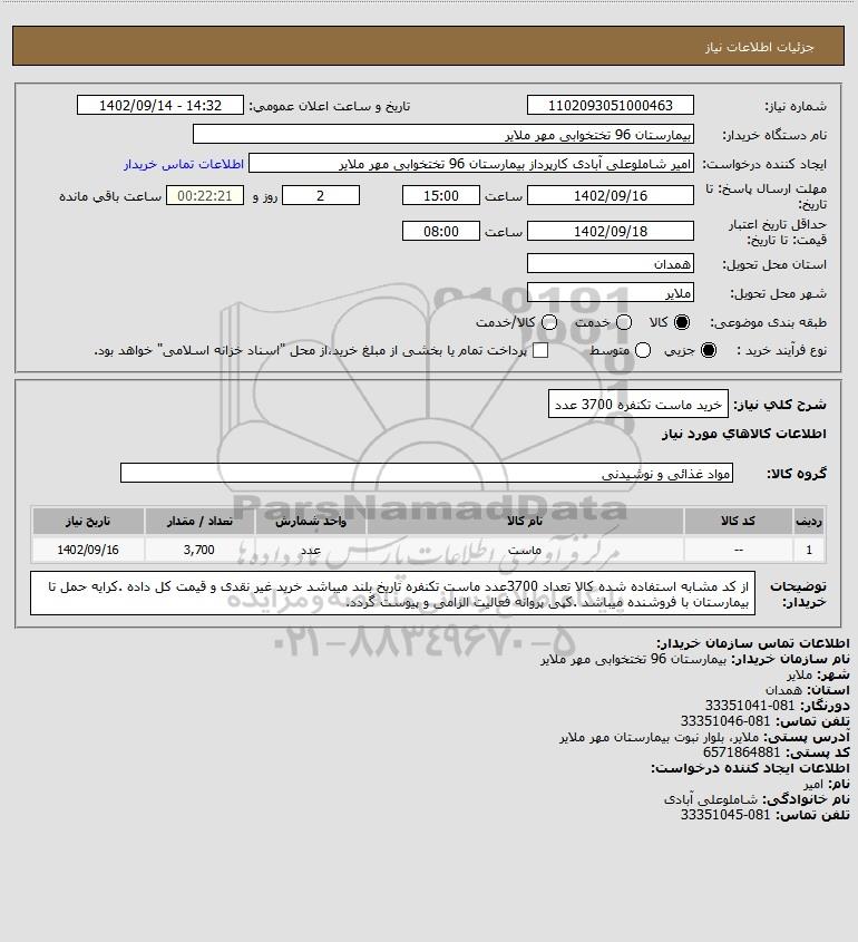 توضیحات خریدار:از کد مشابه استفاده شده کالا تعداد 3700عدد ماست تکنفره تاریخ بلند میباشد خرید غیر نقدی و قیمت کل داده .کرایه حمل تا بیمارستان با فروشنده میباشد .کپی پروانه فعالیت الزامی و پیوست گردد.