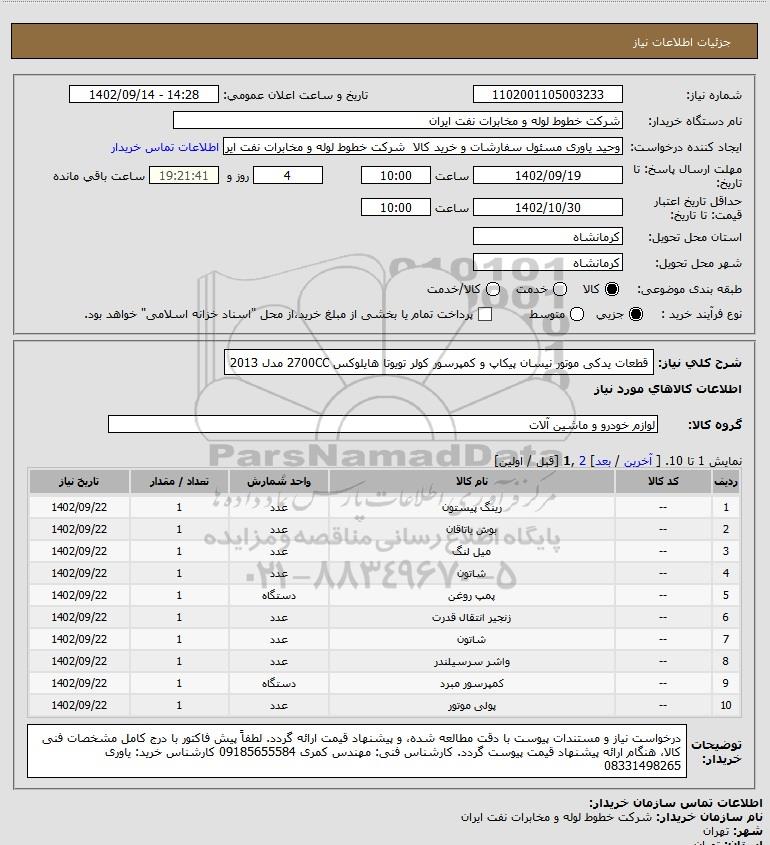 شرح کلی نیاز: قطعات یدکی موتور نیسان پیکاپ و کمپرسور کولر تویوتا هایلوکس 2700CC مدل 2013