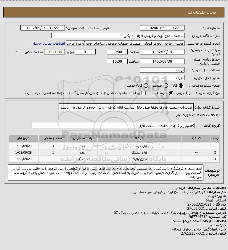 | 2 | -- | هارد دیسک | عدد | 1 | 1402/09/29 |