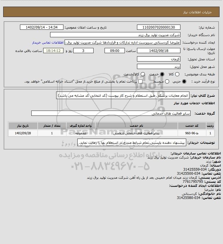 شرح کلی نیاز: انجام معاینات پزشکی طبق استعلام و شرح کار پیوست (کد انتخابی کد مشابه می باشد)