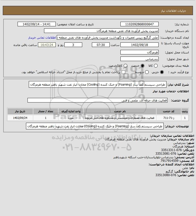 شرح کلی نیاز: طراحی سیستم کف ساز (Foaming) و خنک کننده (Cooling) مخازن انبار نفت شهید باهنر منطقه هرمزگان