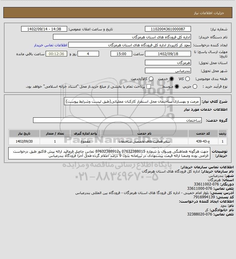 شرح کلی نیاز: مرمت و بهسازی ساختمان محل استقرار کارکنان عملیاتی(طبق لیست وشرایط پیوست)