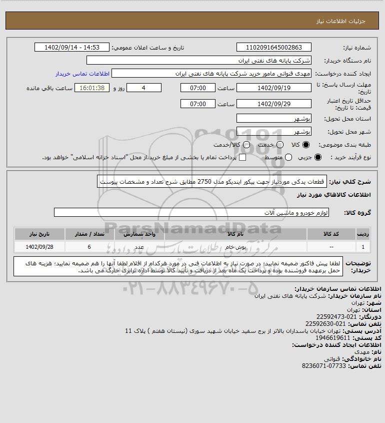 شرح کلی نیاز: قطعات یدکی موردنیاز جهت پیکور ایندیکو مدل 2750 مطابق شرح تعداد و مشخصات پیوست