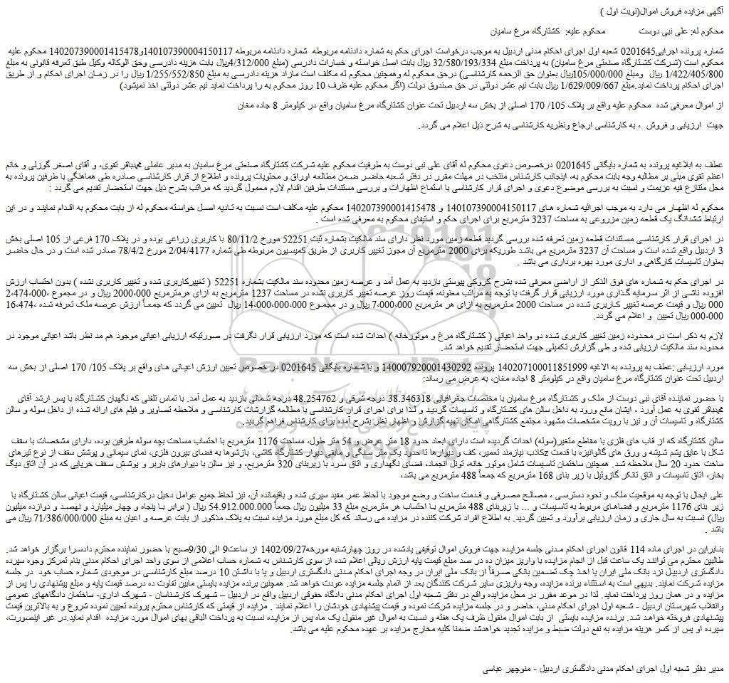 شماره پرونده اجرایی0201645 شعبه اول اجرای احکام مدنی اردبیل به موجب درخواست اجرای حکم به شماره دادنامه مربوطه شماره دادنامه مربوطه 140107390004150117و140207390001415478 محکوم علیه محکوم است (شرکت کشتارگاه صنعتی مرغ سامیان) به پرداخت مبلغ 32/580/193/334 ریال بابت اصل خواسته و خسارات دادرسی (مبلغ 4/312/000ریال بابت هزینه دادرسی وحق الوکاله وکیل طبق تعرفه قانونی به مبلغ 1/422/405/800 ریال ومبلغ 105/000/000ریال بعنوان حق الزحمه کارشناسی) درحق محکوم له وهمچنین محکوم له مکلف است مازاد هزینه دادرسی به مبلغ 1/255/552/850 ریال را در زمان اجرای احکام و از طریق اجرای احکام پرداخت نماید.مبلغ 1/629/009/667 ریال بابت نیم عشر دولتی در حق صندوق دولت (اگر محکوم علیه ظرف 10 روز محکوم به را پرداخت نماید نیم عشر دولتی اخذ نمیشود)