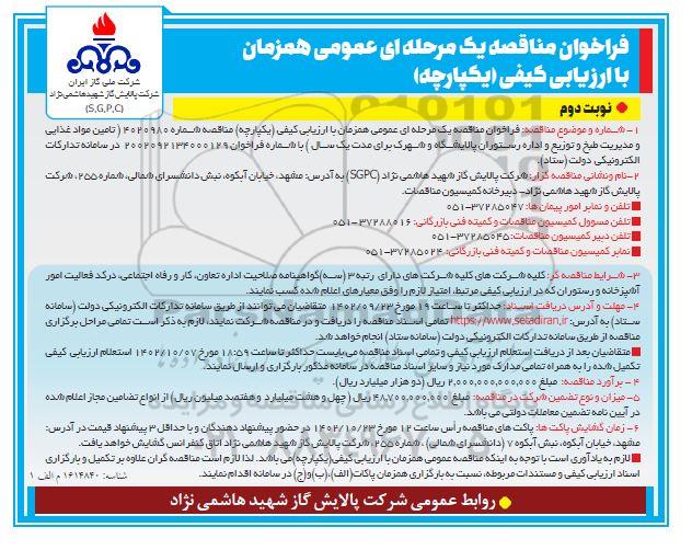 1- شماره و موضوع مناقصه: فراخوان مناقصه یک مرحله ای عمومی همزمان با ارزیابی کیفی (یکپارچه) مناقصه شماره 4020980 ( تامین مواد غذایی و مدیریت طبخ و توزیع و اداره رستوران پالایشگاه و شهرک برای مدت یک سال) با شماره فراخوان 2002092134000129 در سامانه تدارکات الکترونیک دولت ستاد