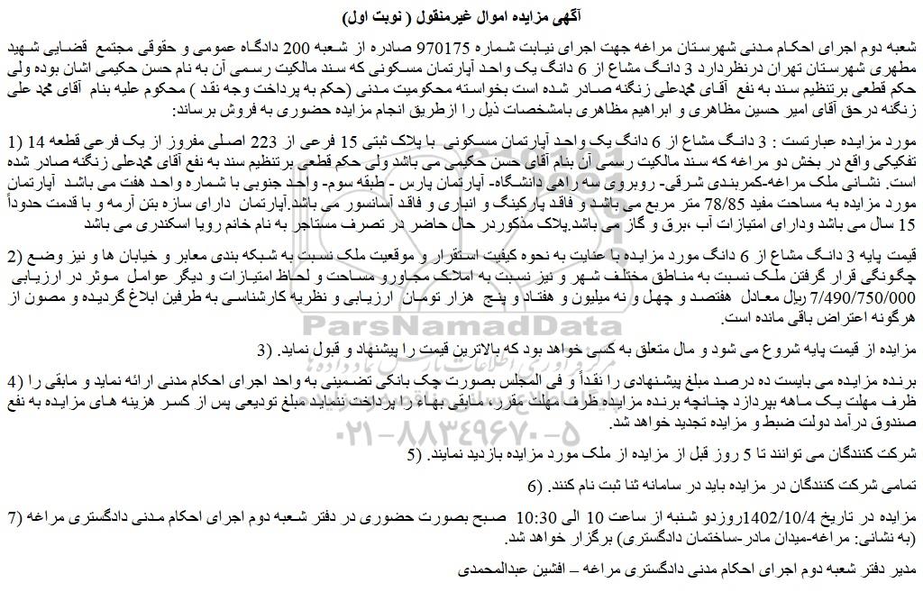 شعبه دوم اجرای احکام مدنی شهرستان مراغه جهت اجرای نیابت شماره 970175 صادره از شعبه 200 دادگاه عمومی و حقوقی مجتمع  قضایی شهید مطهری شهرستان تهران درنظردارد 3 دانگ مشاع از 6 دانگ یک واحد آپارتمان مسکونی که سند مالکیت رسمی آن به نام حسن حکیمی اشان بوده ولی حکم قطعی برتنظیم سند به نفع  آقای محمدعلی زنگنه صادر شده است بخواسته محکومیت مدنی (حکم به پرداخت وجه نقد ) محکوم علیه بنام  آقای محمد علی زنگنه درحق آقای امیر حسین مظاهری و ابراهیم مظاهری بامشخصات ذیل را ازطریق انجام مزایده حضوری به فروش برساند: