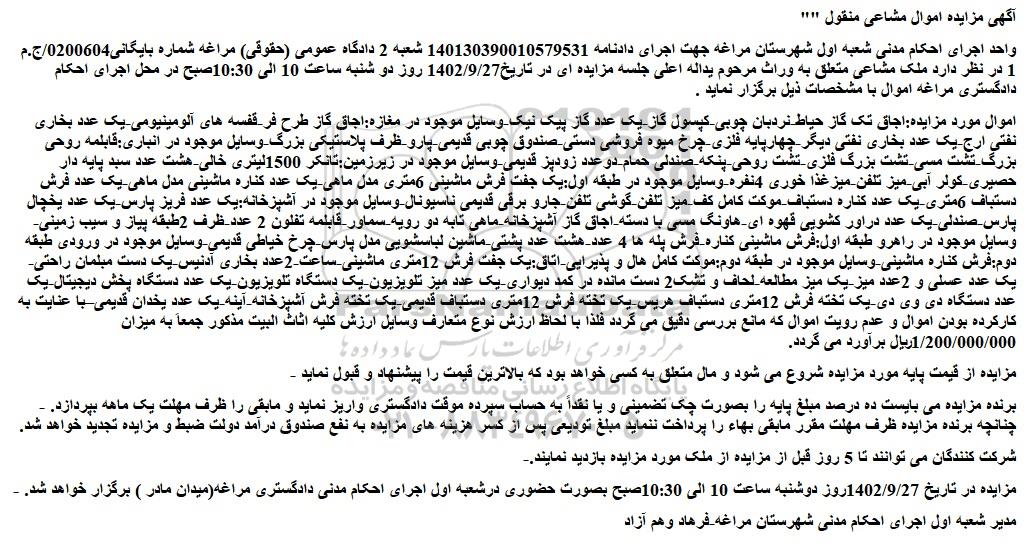 اموال مورد مزایده:اجاق تک گاز حیاط-نردبان چوبی-کپسول گاز-یک عدد گاز پیک نیک-وسایل موجود در مغازه:اجاق گاز طرح فر-قفسه های آلومینیومی-یک عدد بخاری نفتی ارج-یک عدد بخاری نفتی دیگر-چهارپایه فلزی-چرخ میوه فروشی دستی-صندوق چوبی قدیمی-پارو-ظرف پلاستیکی بزرگ-وسایل موجود در انباری:قابلمه روحی بزرگ-تشت مسی-تشت بزرگ فلزی-تشت روحی-پنکه-صندلی حمام-دوعدد زودپز قدیمی-وسایل موجود در زیرزمین:تانکر 1500لیتری خالی-هشت عدد سبد پایه دار حصیری-کولر آبی-میز تلفن-میزغذا خوری 4نفره-وسایل موجود در طبقه اول:یک جفت فرش ماشینی 6متری مدل ماهی-یک عدد کناره ماشینی مدل ماهی-یک عدد فرش دستباف 6متری-یک عدد کناره دستباف-موکت کامل کف-میز تلفن-گوشی تلفن-جارو برقی قدیمی ناسیونال-وسایل موجود در آشپزخانه:یک عدد فریز پارس-یک عدد یخچال پارس-صندلی-یک عدد دراور کشویی قهوه ای-هاونگ مسی با دسته-اجاق گاز آشپزخانه-ماهی تابه دو رویه-سماور-قابلمه تفلون 2 عدد-ظرف 2طبقه پیاز و سیب زمینی-وسایل موجود در راهرو طبقه اول:فرش ماشینی کناره-فرش پله ها 4 عدد-هشت عدد پشتی-ماشین لباسشویی مدل پارس-چرخ خیاطی قدیمی-وسایل موجود در ورودی طبقه دوم:فرش کناره ماشینی-وسایل موجود در طبقه دوم:موکت کامل هال و پذیرایی-اتاق:یک جفت فرش 12متری ماشینی-ساعت-2عدد بخاری آدنیس-یک دست مبلمان راحتی-یک عدد عسلی و 2عدد میز-یک میز مطالعه-لحاف و تشک2 دست مانده در کمد دیواری-یک عدد میز تلویزیون-یک دستگاه تلویزیون-یک عدد دستگاه پخش دیجیتال-یک عدد دستگاه دی وی دی-یک تخته فرش 12متری دستباف هریس-یک تخته فرش 12متری دستباف قدیمی-یک تخته فرش آشپزخانه-آینه-یک عدد یخدان قدیمی–با عنایت به کارکرده بودن اموال و عدم رویت اموال که مانع بررسی دقیق می گردد فلذا با لحاظ ارزش نوع متعارف وسایل ارزش کلیه اثاث البیت مذکور جمعاَ به میزان 1/200/000/000ریال برآورد می گردد.