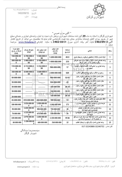 شهرداری گرگان در نظر دارد با استناد ماده 29 آیین نامه معاملات شهرداری نسبت به اجاره واحدهای تجاری و خدماتی سطح شهر از طریق حراج آنلاین (سامانه ستاد) بر مبنای پایه قیمت کارشناسی اقدام نماید. لذا متقاضیان می توانند از تاریخ 1402.9.18 لغایت آخر وقت اداری مورخ 1402.10.04 به سامانه ستاد آدرس اینترنتی ستاد ایران مراجعه نمایند