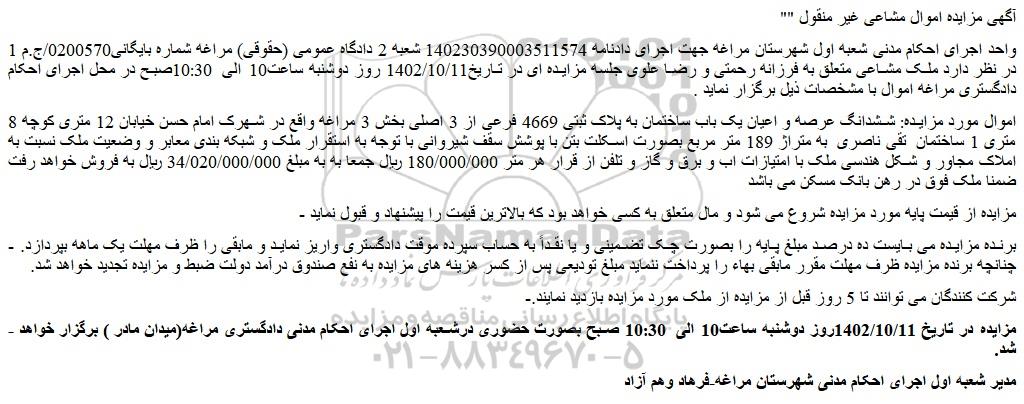 واحد اجرای احکام مدنی شعبه اول شهرستان مراغه جهت اجرای دادنامه 140230390003511574 شعبه 2 دادگاه عمومی (حقوقی) مراغه شماره بایگانی0200570/ج.م 1 در نظر دارد ملک مشاعی متعلق به فرزانه رحمتی و رضا علوی جلسه مزایده ای در تاریخ1402/10/11 روز دوشنبه ساعت10 الی  10:30صبح در محل اجرای احکام دادگستری مراغه اموال با مشخصات ذیل برگزار نماید .
