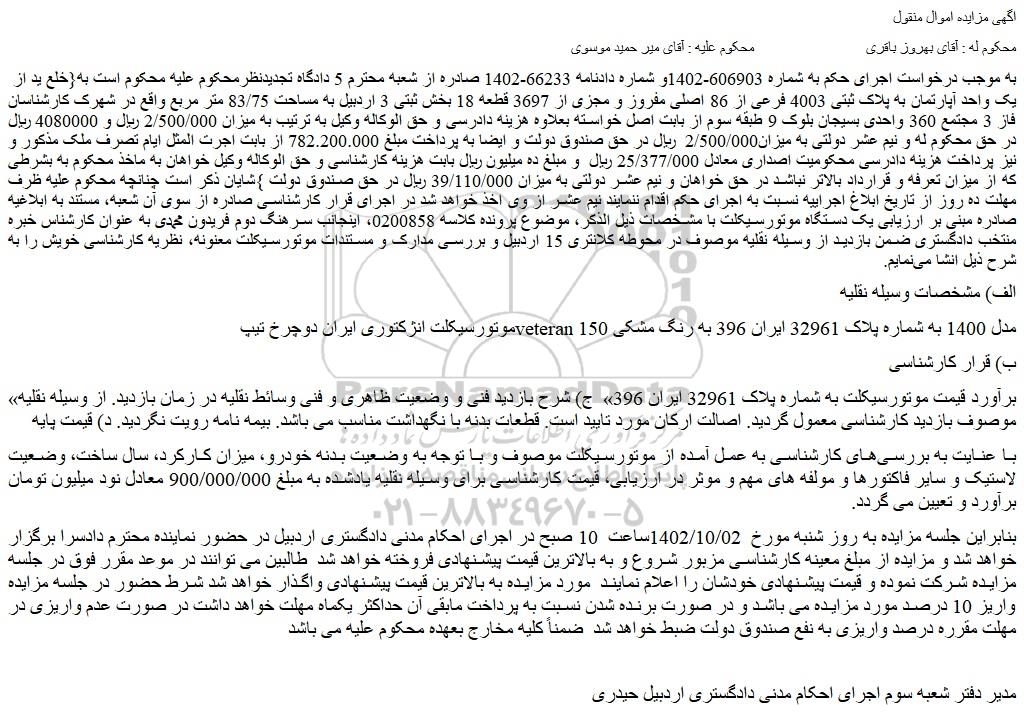 به موجب درخواست اجرای حکم به شماره 606903-1402و شماره دادنامه 66233-1402 صادره از شعبه محترم 5 دادگاه تجدیدنظرمحکوم علیه محکوم است به{خلع ید از یک واحد آپارتمان به پلاک ثبتی 4003 فرعی از 86 اصلی مفروز و مجزی از 3697 قطعه 18 بخش ثبتی 3 اردبیل به مساحت 83/75 متر مربع واقع در شهرک کارشناسان فاز 3 مجتمع 360 واحدی بسیجان بلوک 9 طبقه سوم از بابت اصل خواسته بعلاوه هزینه دادرسی و حق الوکاله وکیل به ترتیب به میزان 2/500/000 ریال و 4080000 ریال در حق محکوم له و نیم عشر دولتی به میزان2/500/000  ریال در حق صندوق دولت و ایضا به پرداخت مبلغ 782.200.000 از بابت اجرت المثل ایام تصرف ملک مذکور و نیز پرداخت هزینه دادرسی محکومیت اصداری معادل 25/377/000 ریال  و مبلغ ده میلیون ریال بابت هزینه کارشناسی و حق الوکاله وکیل خواهان به ماخذ محکوم به بشرطی که از میزان تعرفه و قرارداد بالاتر نباشد در حق خواهان و نیم عشر دولتی به میزان 39/110/000 ریال در حق صندوق دولت }شایان ذکر است چنانچه محکوم علیه ظرف مهلت ده روز از تاریخ ابلاغ اجراییه نسبت به اجرای حکم اقدام ننمایند نیم عشر از وی اخذ خواهد شد در اجرای قرار کارشناسی صادره از سوی آن شعبه، مستند به ابلاغیه صادره مبنی بر ارزیابی یک دستگاه موتورسیکلت با مشخصات ذیل الذکر، موضوع پرونده کلاسه 0200858، اینجانب سرهنگ دوم فریدون محمدی به عنوان کارشناس خبره منتخب دادگستری ضمن بازدید از وسیله نقلیه موصوف در محوطه کلانتری 15 اردبیل و بررسی مدارک و مستندات موتورسیکلت معنونه، نظریه کارشناسی خویش را به شرح ذیل انشا می نمایم.