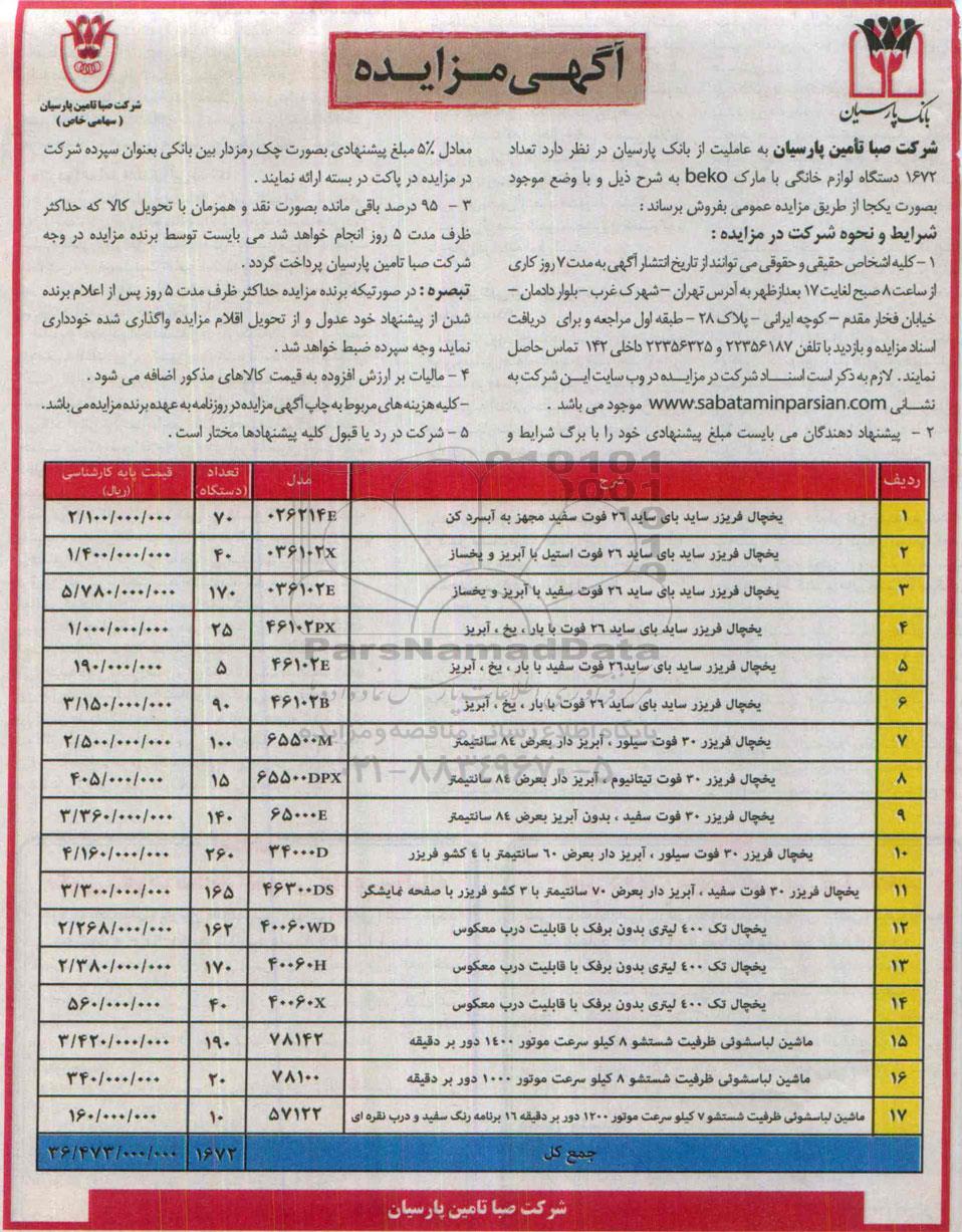 شرکت صبا تامین پارسیان به عاملیت از بانک پارسیان در نظر دارد تعداد 1672 دستگاه لوازم خانگی با مارک BEKO به شرح ذیل و با وضع موجود از طریق مزایده عمومی بفروش رساند
