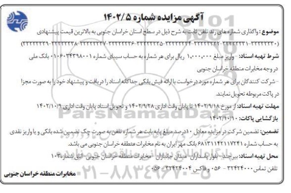 موضوع: واگذاری شماره های رند تلفن ثابت در سطح استان خراسان جنوبی به بالاترین قیمت پیشنهادی با شماره تلفن های 33333330-33333331-333333332 -33333334-33333335-33333336-33333337-+33333338-3333339 شرط تهیه اسناد: