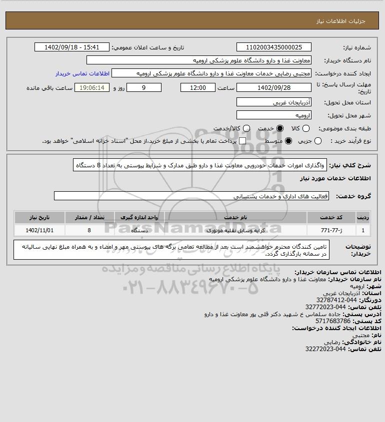 شرح کلی نیاز: واگذاری امورات خدمات خودرویی معاونت غذا و دارو طبق مدارک و شرایط پیوستی به تعداد 8 دستگاه