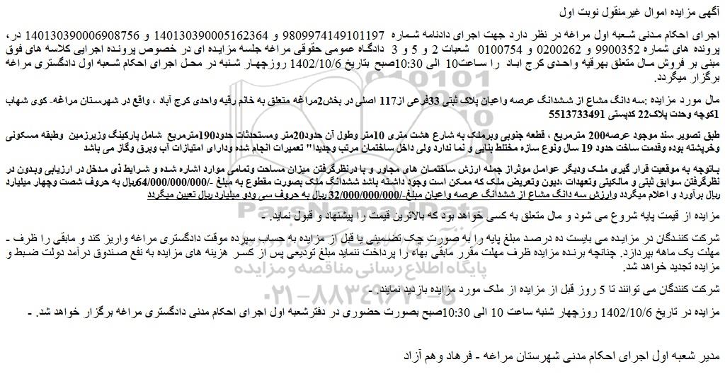 - مزایده در تاریخ 1402/10/6 روزچهار شنبه ساعت 10 الی 10:30صبح بصورت حضوری در دفترشعبه اول اجرای احکام مدنی دادگستری مراغه برگزار خواهد شد.