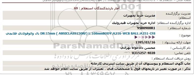 موضوع : DN:15mm ( ANSICLASS150RF) L:108mmBODY:A216-WCB BALL:A351-CF8 بال والوفولادی فلانچی مهلت ارائه پیشنهاد : 1395/03/16