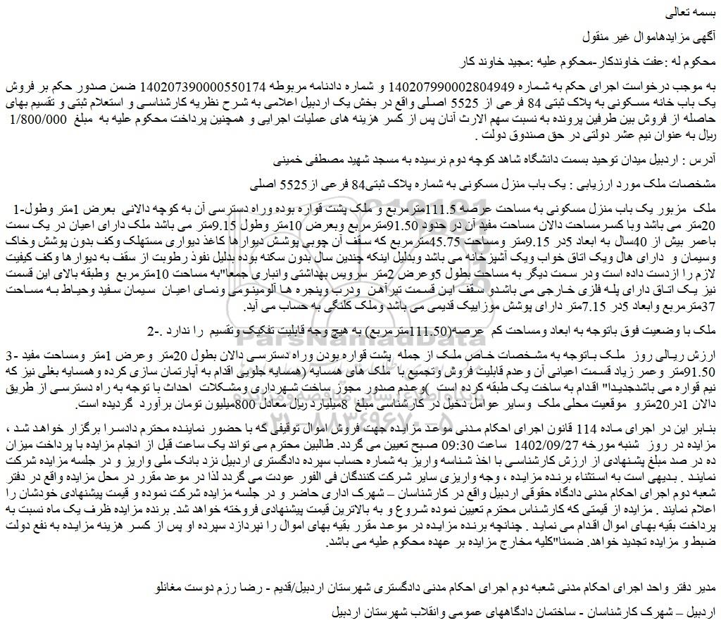 به موجب درخواست اجرای حکم به شماره 140207990002804949 و شماره دادنامه مربوطه 140207390000550174 ضمن صدور حکم بر فروش یک باب خانه مسکونی به پلاک ثبتی 84 فرعی از 5525 اصلی واقع در بخش یک اردبیل اعلامی به شرح نظریه کارشناسی و استعلام ثبتی و تقسیم بهای حاصله از فروش بین طرفین پرونده به نسبت سهم الارث آنان پس از کسر هزینه های عملیات اجرایی و همچنین پرداخت محکوم علیه به مبلغ 1/800/000 ریال به عنوان نیم عشر دولتی در حق صندوق دولت .