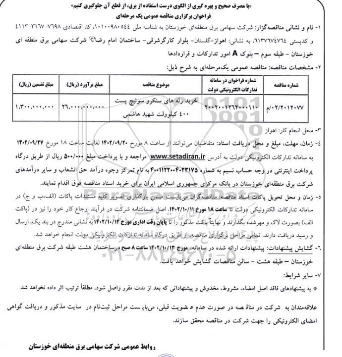 | 2012077/ 02/ م | 2002001262000110 | خرید رله های سنکرو سوئیچ پست 400 کیلوولت نشهید هاشمی | 26.000.000.000 | 1.300.000.000 |