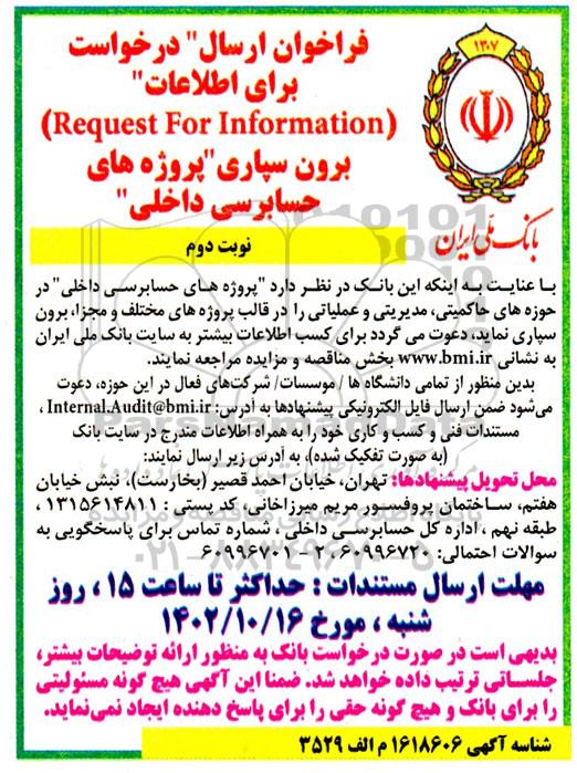 فراخوان ارسال درخواست برای اطلاعات (Request For Information) برون سپاری "پروژه های حسابرسی داخلی"- نوبت دوم, فراخوان ارسال درخواست برای اطلاعات (Request For Information) برون سپاری "پروژه های حسابرسی داخلی"- نوبت دوم