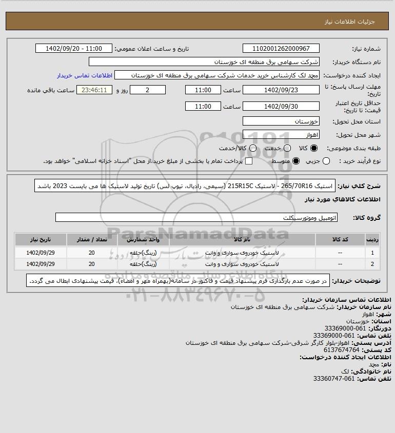 | 2 | -- | لاستیک خودروی سواری و وانت | (رینگ)حلقه | 20 | 1402/09/29 |
