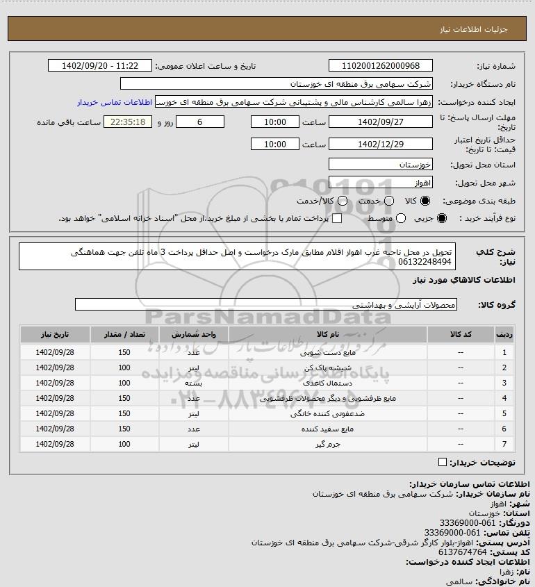 استعلام تحویل در محل ناحیه غرب اهواز اقلام مطابق مارک درخواست و اصل حداقل پرداخت 3 ماه تلفن جهت هماهنگی 06132248494, استعلام تحویل در محل ناحیه غرب اهواز اقلام مطابق مارک درخواست و اصل حداقل پرداخت 3 ماه تلفن جهت هماهنگی 06132248494