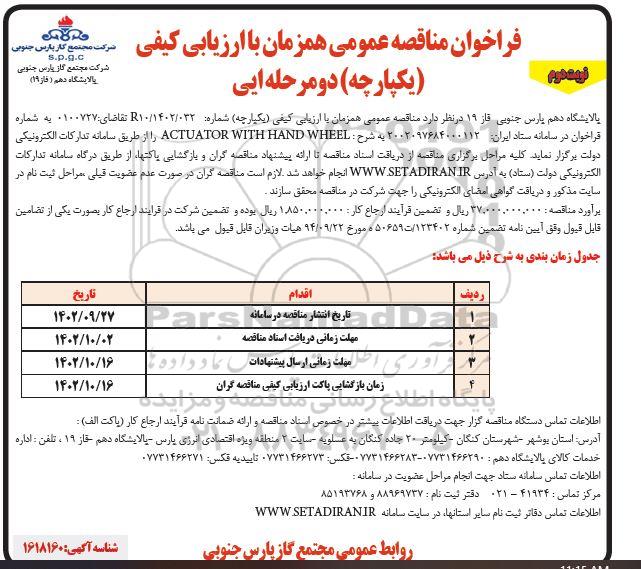 پالایشگاه دهم پارس جنوبی فاز 19 در نظر دارد مناقصه عمومی همزمان با ارزیابی کیفی یکپارچه شماره R10/1402/032 تقاضای 0100727 به شماره فراخوان در سامانه ستاد ایران 2002097684000112 به شرح ACTUATOR WITH HAND WHEEL را از طریق سامانه تدارکات الکترونیکی دولت برگزار نماید. کلیه مراحل برگزاری مناقصه از دریافت اسناد مناقصه تا ارائه پیشنهاد مناقصه گران و بازگشایی پاکتها، از طریق درگاه سامانه تدارکات الکترونیکی دولت ستاد به آدرس ستاد ایران انجام خواهد شد لازم است مناقصه گران در صورت عدم عضویت قبلی، مراحل ثبت نام در سایت مذکور و دریافت گواهی امضای الکترونیکی را جهت شرکت در مناقصه محقق سازند.