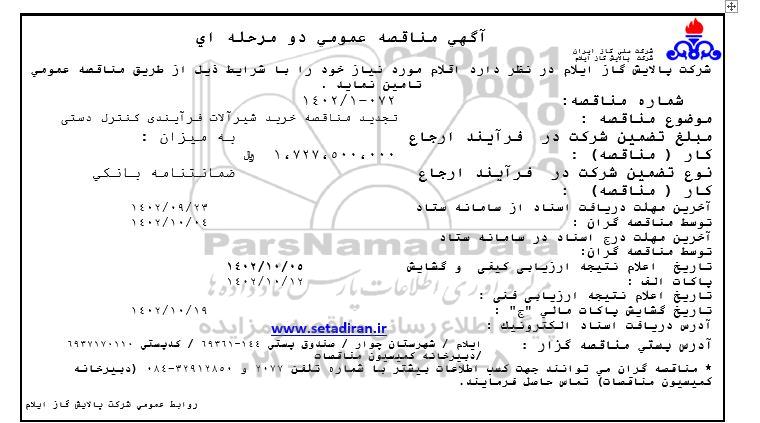 شرکت پالایش گاز ایلام در نظر دارد اقلام مورد نیاز خود را با شرایط ذیل از طریق مناقصه عمومی تامین نماید.