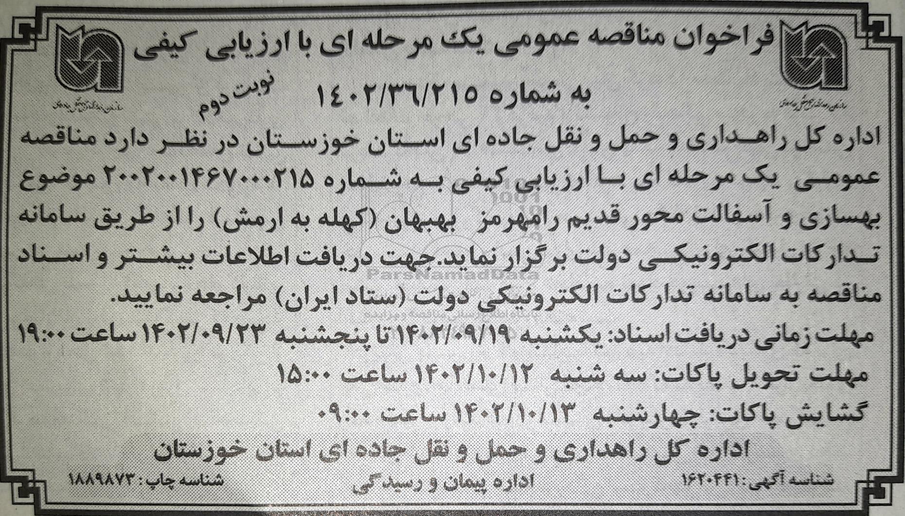 اداره کل راهداری و حمل و نقل جاده ای استان خوزستان در نظر دارد مناقصه عمومی یک مرحله ای با ارزیابی کیفی به شماره 2002001467000215 موضوع بهسازی آسفالت محور قدیم رامهرمز -بهبهان (کهله به ارمش ) را از طریق سامانه تدارکات الکترونیکی دولت برگزار نماید. جهت دریافت اطلاعات بیشتر و اسناد مناقصه به سامانه تدارکات الکترونیکی دولت (ستاد ایران) مراجعه نمایید.
