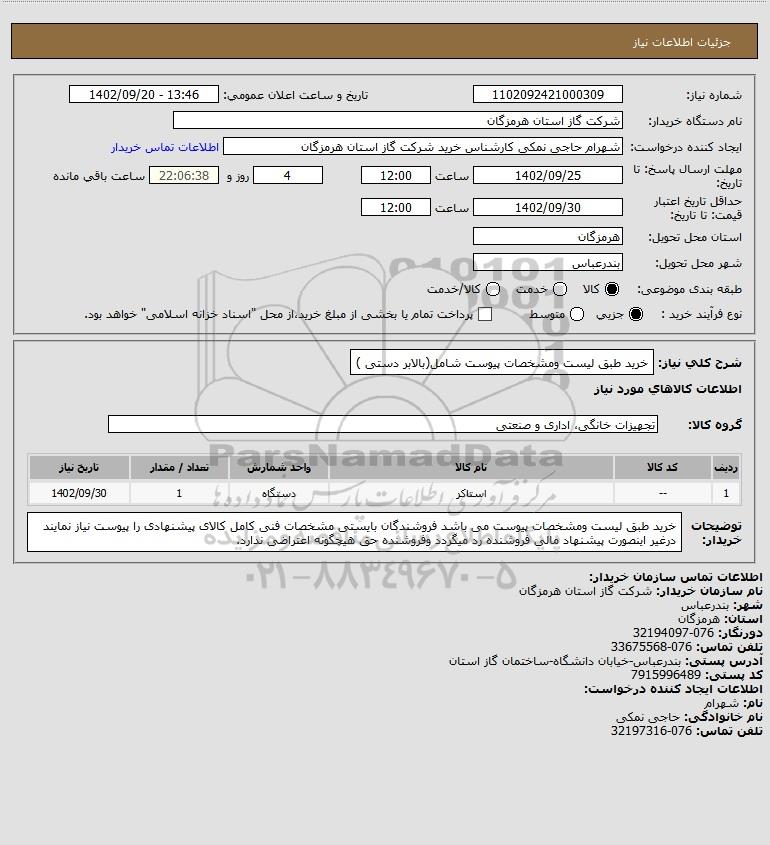 نام دستگاه خریدار:شرکت گاز استان هرمزگان
