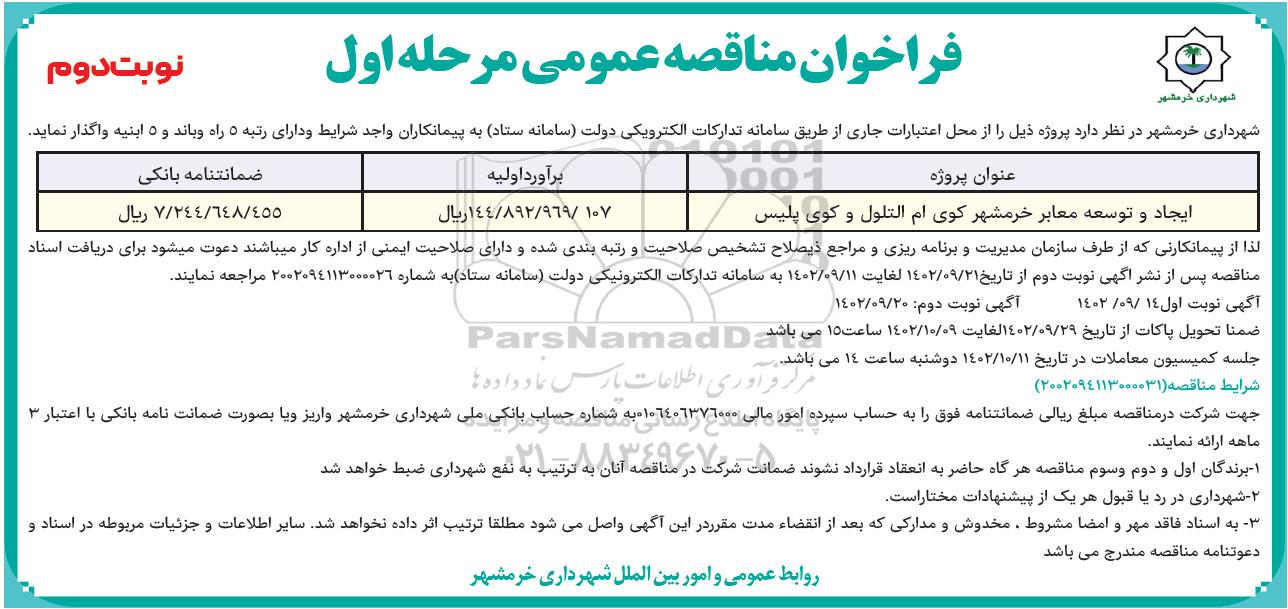 فراخوان مناقصه ایجاد و توسعه معابر خرمشهر  کوی ام التلول- نوبت دوم , فراخوان مناقصه ایجاد و توسعه معابر خرمشهر  کوی ام التلول- نوبت دوم