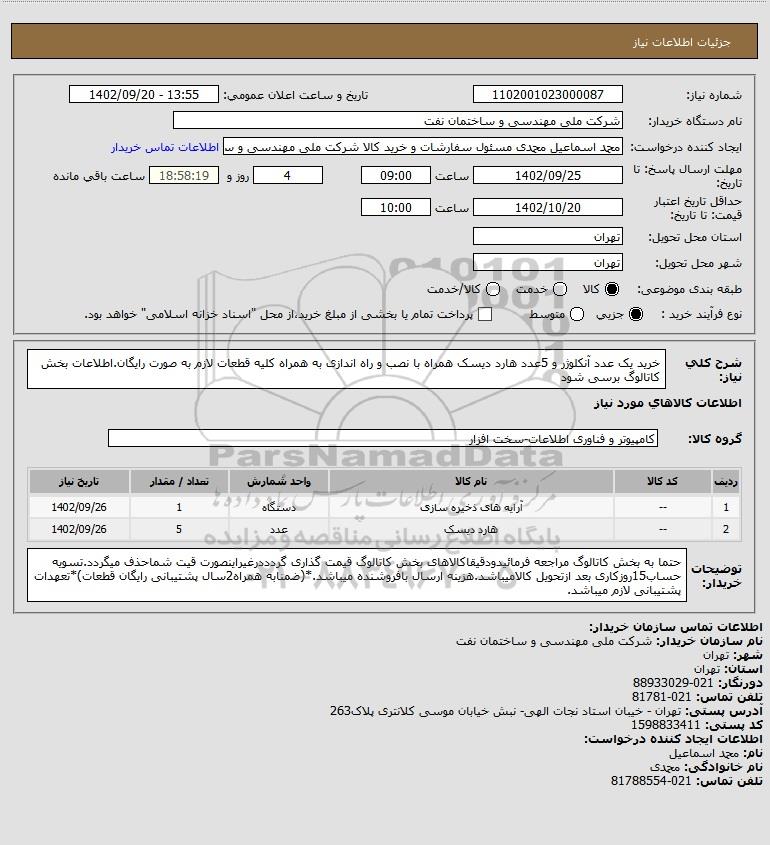 شرح کلی نیاز: خرید یک عدد آنکلوژر و 5عدد هارد دیسک همراه با نصب و راه اندازی به همراه کلیه قطعات لازم به صورت رایگان.اطلاعات بخش کاتالوگ برسی شود