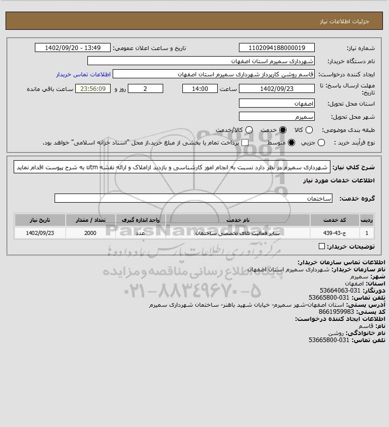 شرح کلی نیاز: شهرداری سمیرم در نظر دارد نسبت به انجام امور کارشناسی و بازدید ازاملاک و ارائه نقشه utm به شرح پیوست اقدام نماید