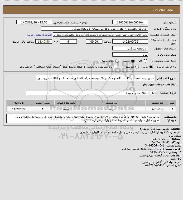 نام دستگاه خریدار:اداره کل راهداری و حمل و نقل جاده ای استان اذربایجان شرقی