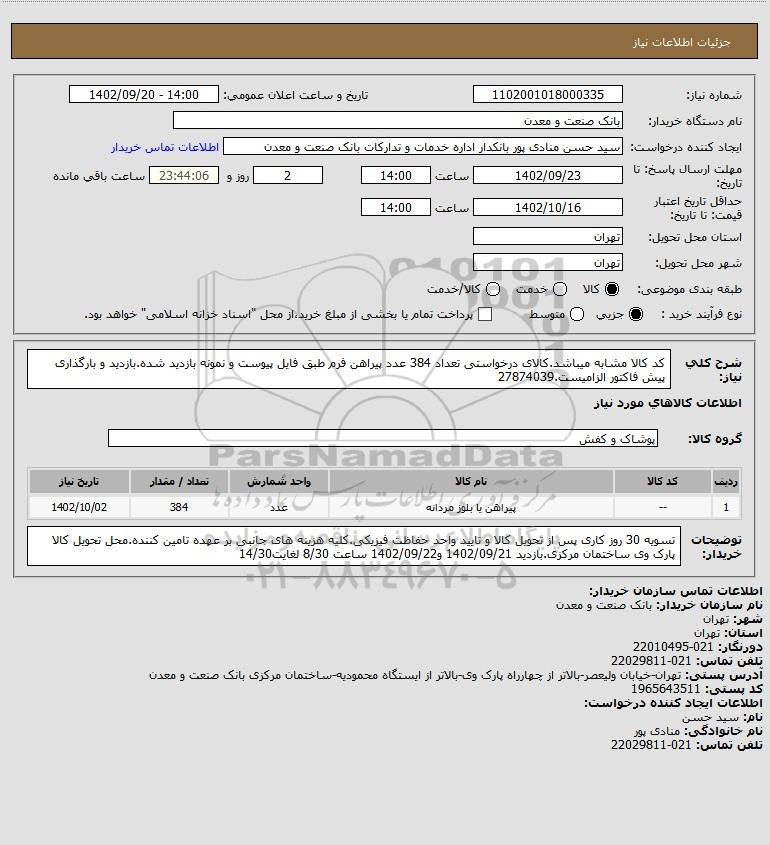 شرح کلی نیاز: کد کالا مشابه میباشد.کالای درخواستی تعداد 384 عدد پیراهن فرم طبق فایل پیوست و نمونه بازدید شده.بازدید و بارگذاری پیش فاکتور الزامیست.27874039