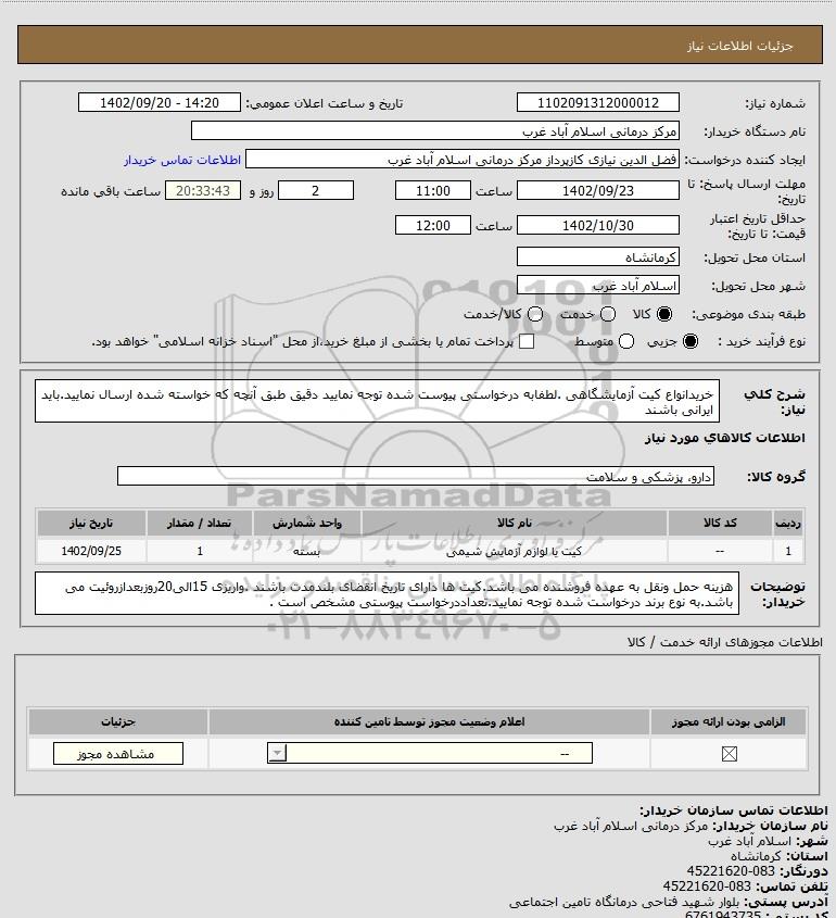 نام دستگاه خریدار:مرکز درمانی اسلام آباد غرب