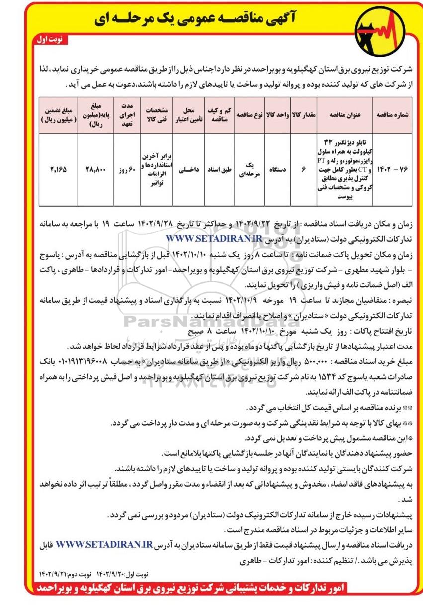 شرکت توزیع نیروی برق استان کهگیلویه و بویراحمد در نظر دارد اجناس ذیل را از طریق مناقصه عمومی خریداری نماید. لذا از شرکت های تولیدکننده و تامین کننده (برندهای مورد تایید شرکت توانیر را ارائه نمایند) که تاییدیه توانیر را اخذ نموده و برابر الزامات توانیر اقدام به تولید کالا می نمایند دعوت به عمل می آید