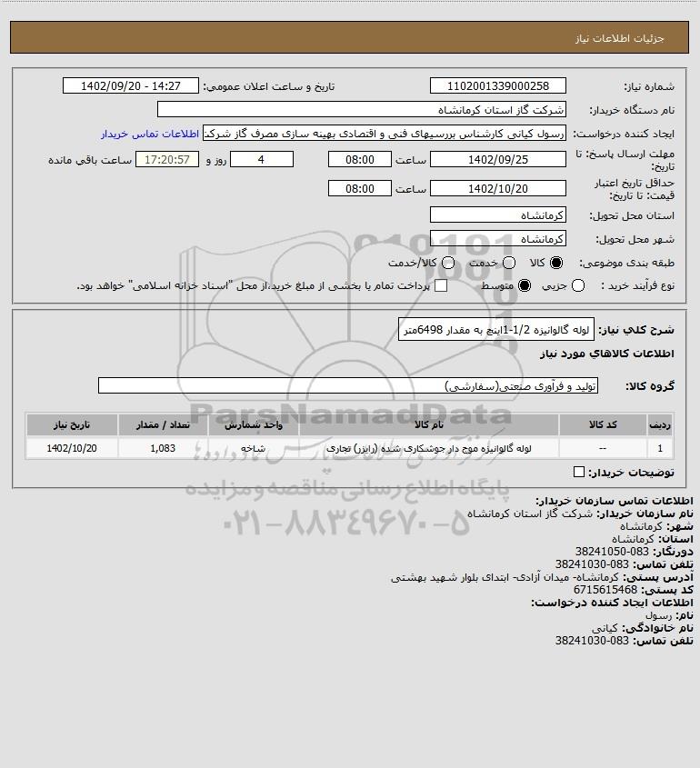 شرح کلی نیاز: لوله گالوانیزه 1/2-1اینچ به مقدار 6498متر