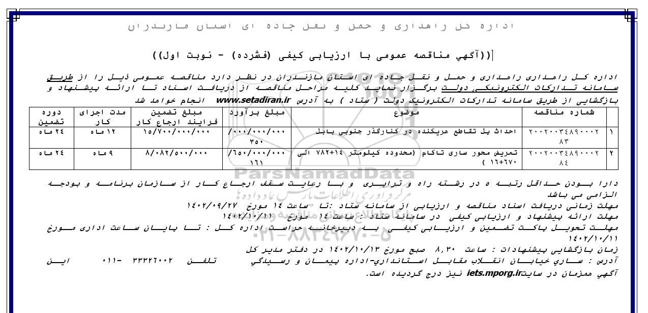 آدرس: ساری، خیابان انقلاب، مقابل استانداری، اداره پیمان و رسیدگی تلفن 33326002-011 این آگهی همزمان در سایت IETS.MPORG.IR نیز درج گردیده است
