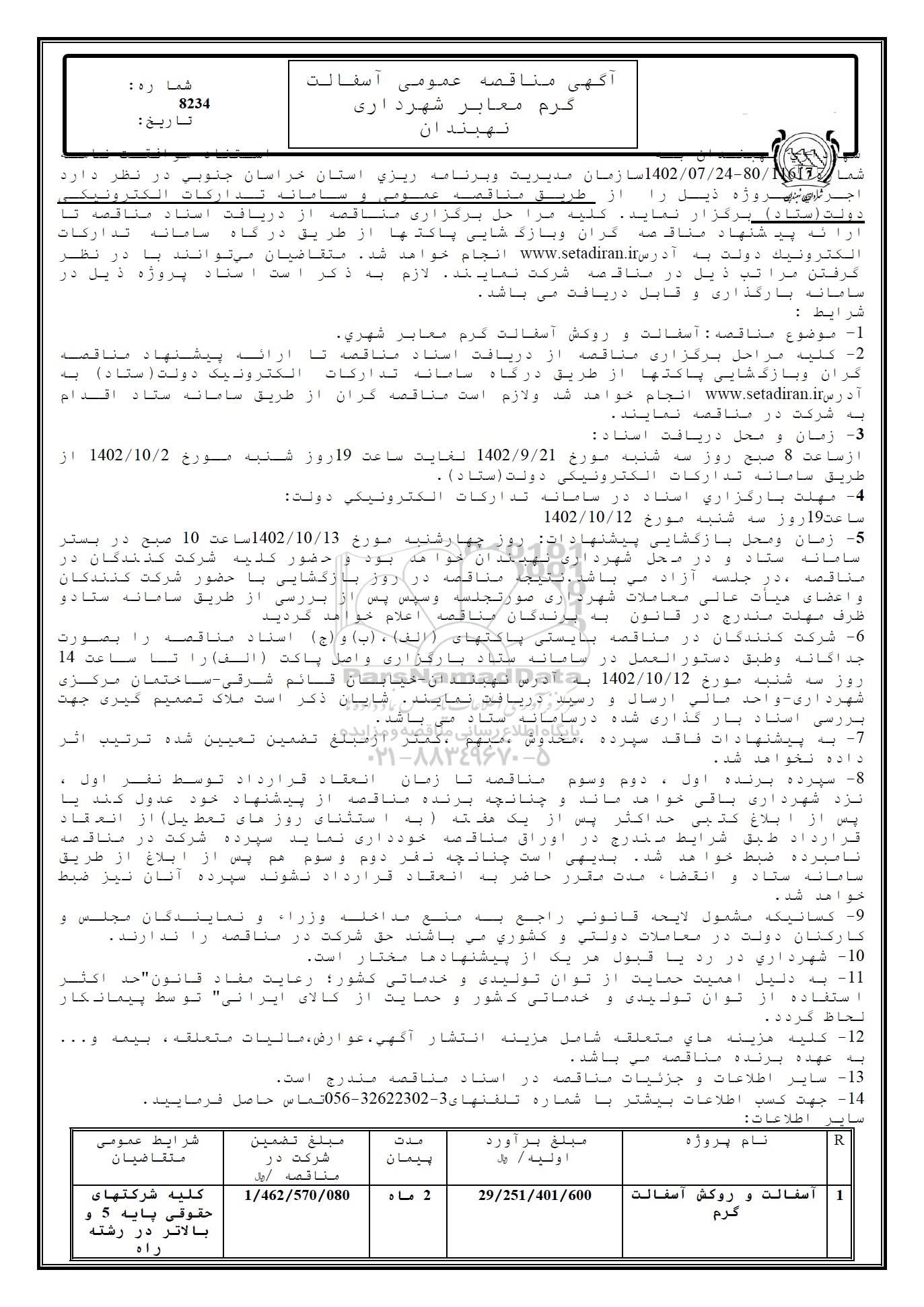 14 - جهت کسب اطلاعات بیشتر با شماره تلفن های 3 - 32622302 - 056 تماس حاصل فرمایید.