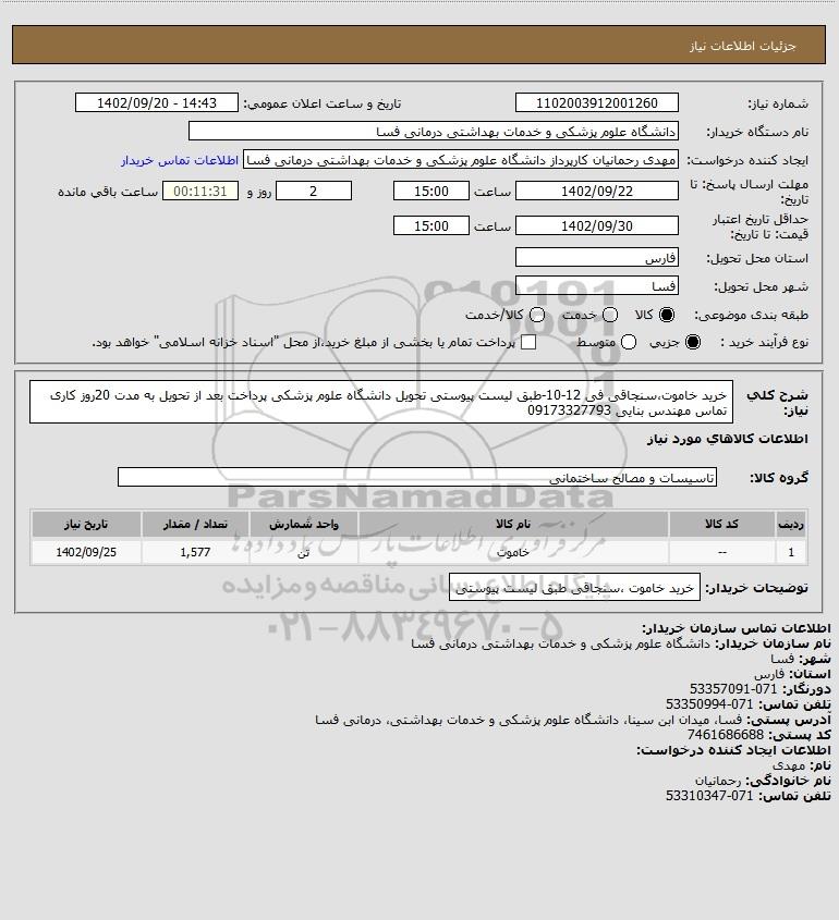 شرح کلی نیاز: خرید خاموت،سنجاقی فی 12-10-طبق لیست پیوستی تحویل دانشگاه علوم پزشکی پرداخت بعد از تحویل به مدت 20روز کاری تماس مهندس بنایی 09173327793