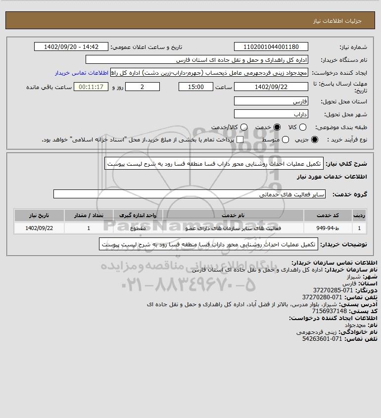 شرح کلی نیاز: تکمیل عملیات احداث روشنایی محور داراب فسا منطقه فسا رود