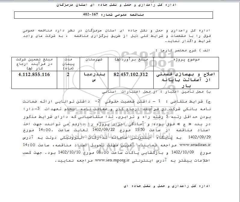 اصلاح و بهسازی قسمتی از آسفالت پایانه بار  82.457.102.312 بندرعباس  2 4.112.855.116
