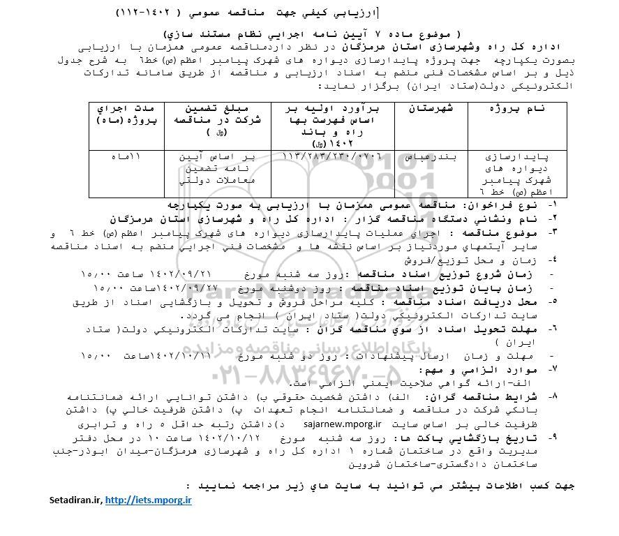 اداره کل راه و شهرسازی استان هرمزگان در نظر دارد مناقصه عمومی همزمان با ارزیابی بصورت یکپارچه جهت پروژه پایدارسازی دیواره های شهرک پیامبر اعظم (ص) خط 2 به شرح جدول ذیل و براساس مشخصات فنی منضم به اسناد ارزیابی و مناقصه از طریق سامانه تدارکات الکترونیکی دولت (ستاد ایران) برگزار نماید.