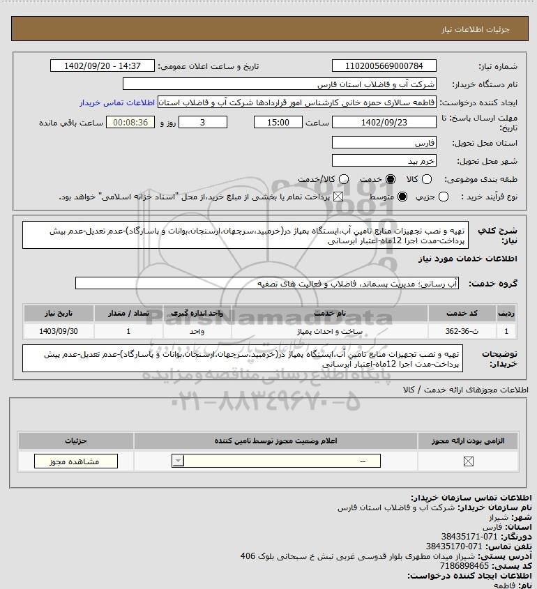 توضیحات خریدار:تهیه و نصب تجهیزات منابع تامین آب،ایستگاه پمپاژ در(خرمبید،سرچهان،ارسنجان،بوانات و پاسارگاد)-عدم تعدیل-عدم پیش پرداخت-مدت اجرا 12ماه-اعتبار آبرسانی