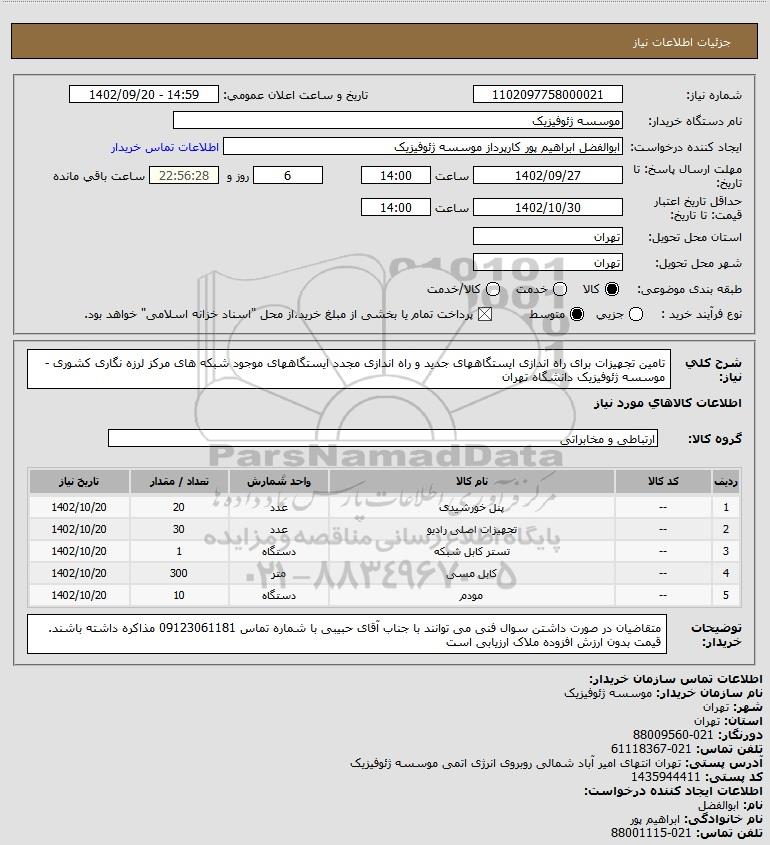 شرح کلی نیاز: تامین تجهیزات برای راه اندازی ایستگاههای جدید و راه اندازی مجدد ایستگاههای موجود شبکه های مرکز لرزه نگاری کشوری - موسسه ژئوفیزیک دانشگاه تهران
