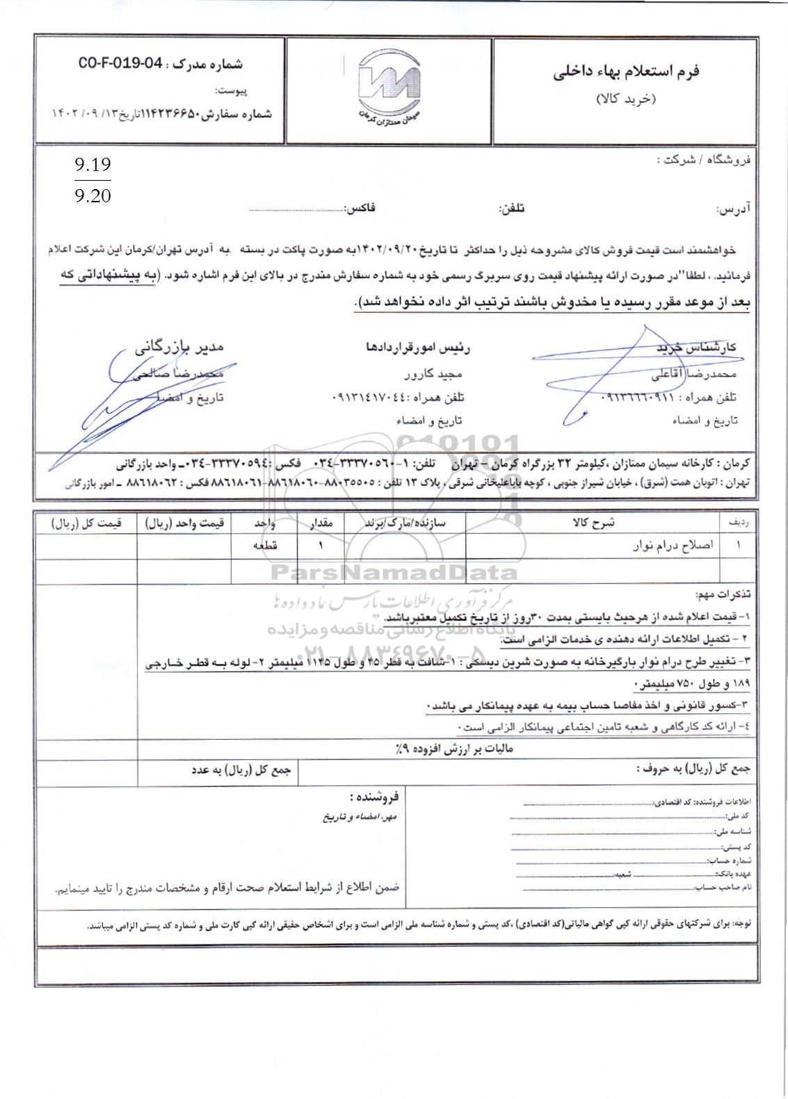خواهشمند است قیمت فروش کالای مشروحه ذیل را حداکثر تا تاریخ 1402.9.20 به صورت پاکت در بسته به آدرس تهران / کرمان این شرکت اعلام فرمائید. لطفا در صورت ارائه پیشنهاد قیمت روی سربرگ رسمی خود به شماره سفارش مندرج در بالای این فرم اشاره شود (به پیشنهاداتی که بعد از موعد مقرر رسیده یا مخدوش باشند ترتیب اثر داد نخواهد شد.