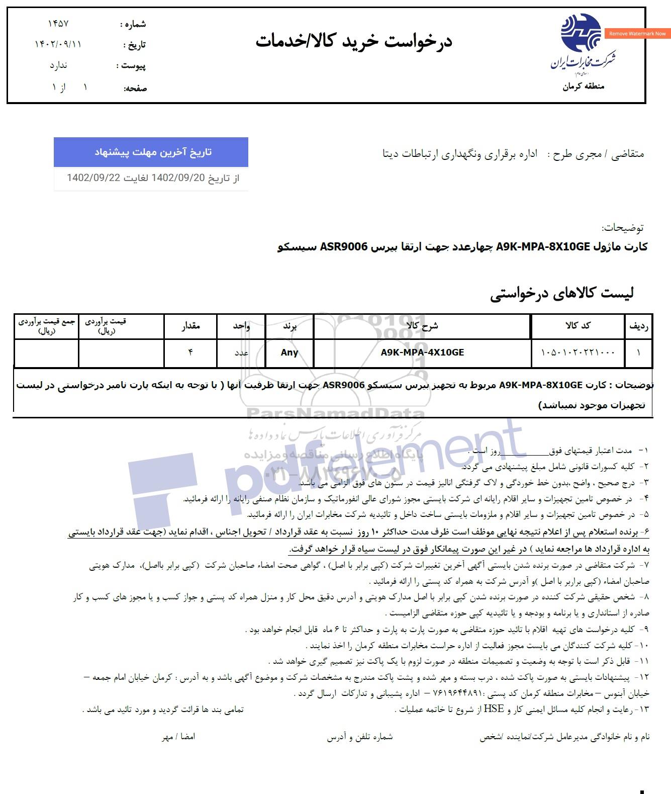 تاریخ اخرین مهلت پیشنهاد: از تاریخ 1402.9.20 لغایت 1402.9.22