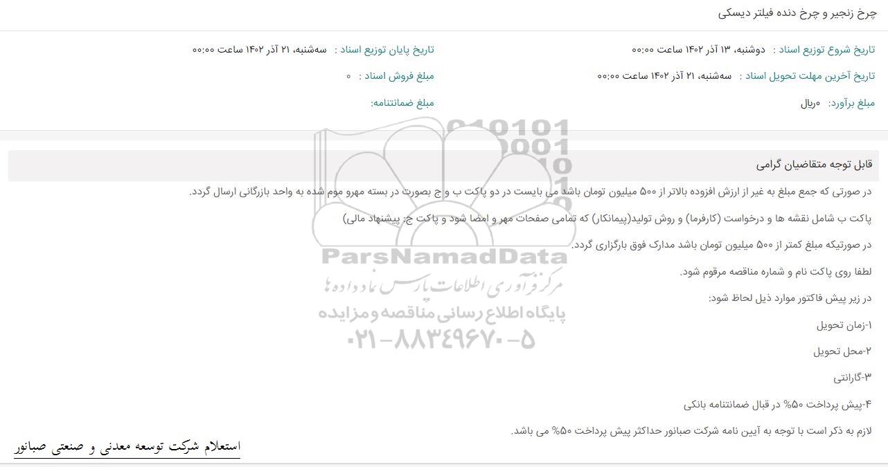 تاریخ آخرین مهلت تحویل اسناد: سه شنبه 21 آذر 1402 ساعت 00:00